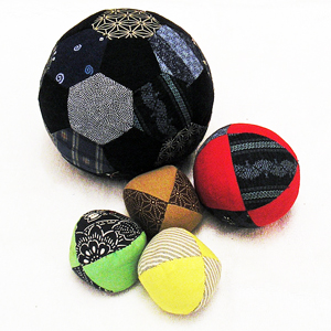 もっと球形に近いお手玉(実用、競技用)となると葉っぱ型四枚あわせ、丸い三角形八枚あわせ、さらにはサッカーボール型だと六角形が20枚と五角形が12枚必要です。