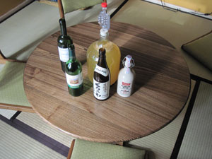 てんてん自宅の宴会部屋。空き瓶ごろごろ。でも蜂蜜ワインは今も蒸留中。