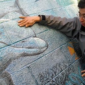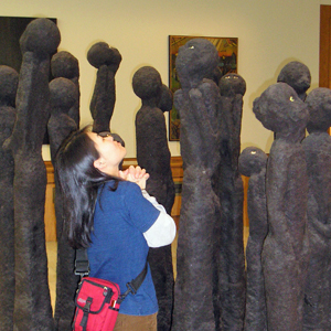 銅像の一部になる高橋アキ(唄、三味線)